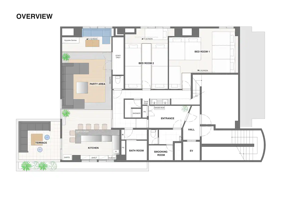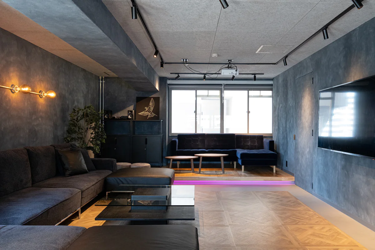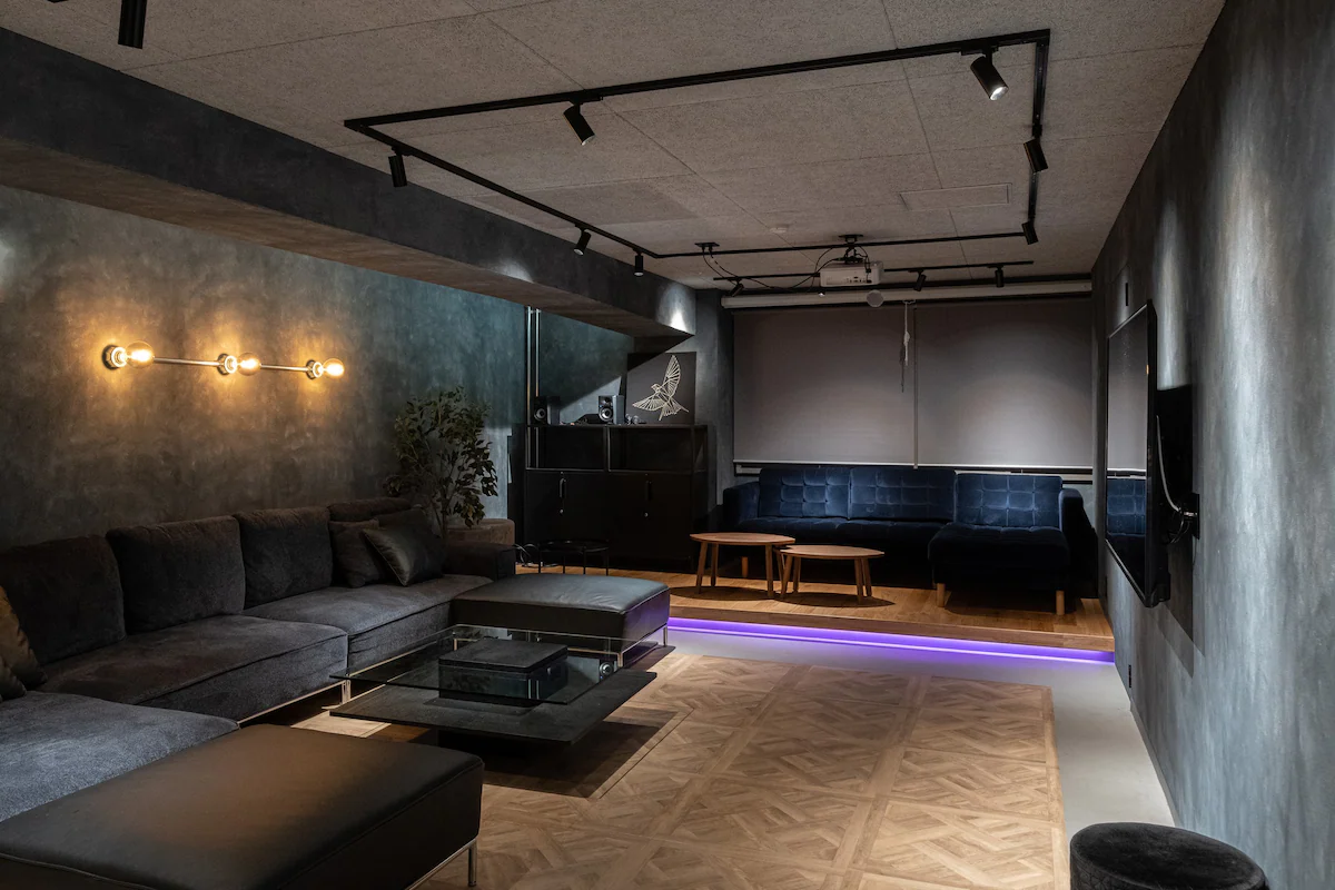 プロジェクターが各部屋に合計3台あり、寝ながら映画やゲームが出来るシアタールームやビジネスにも使用出来るミーティングルームにもなります。