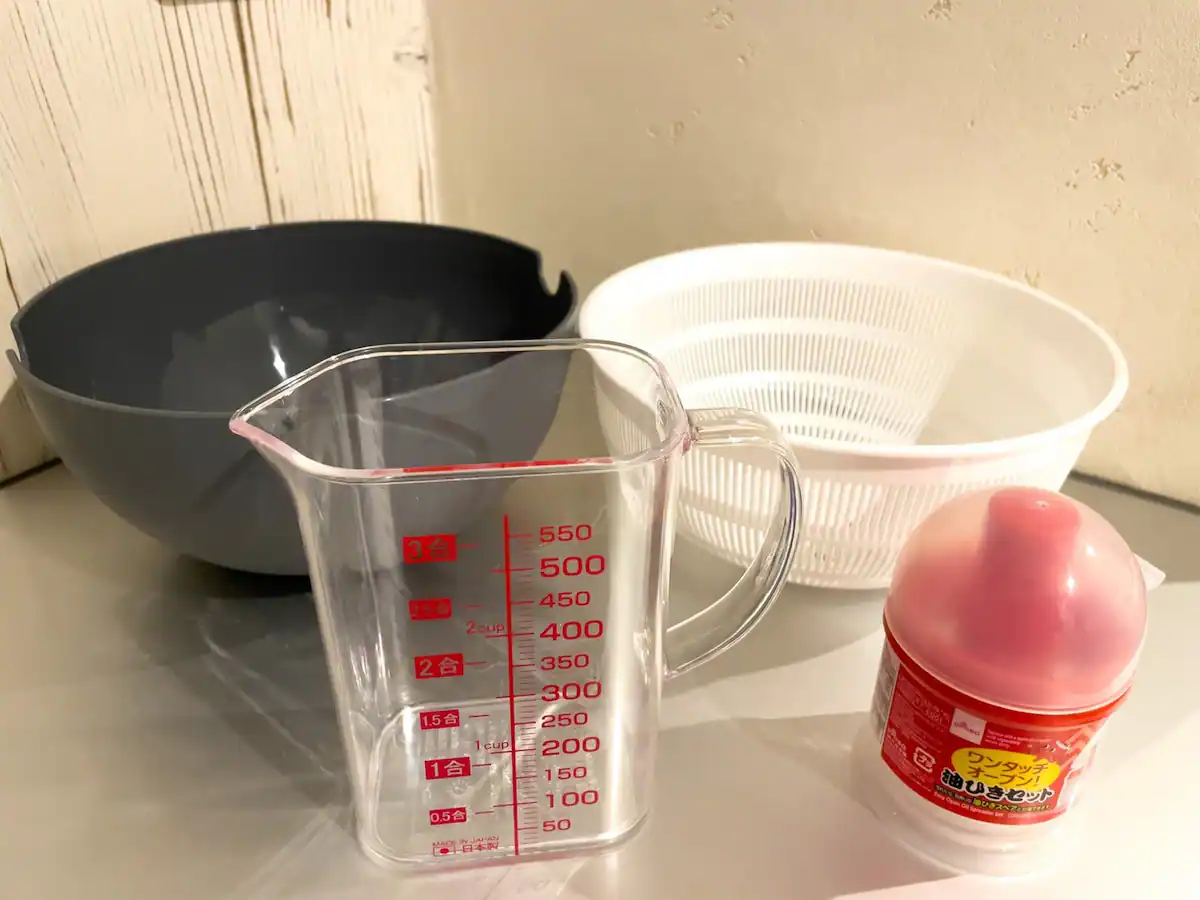・おたま、菜箸、フライ返し、ザル、ボウル、包丁、まな板など調理器具一式